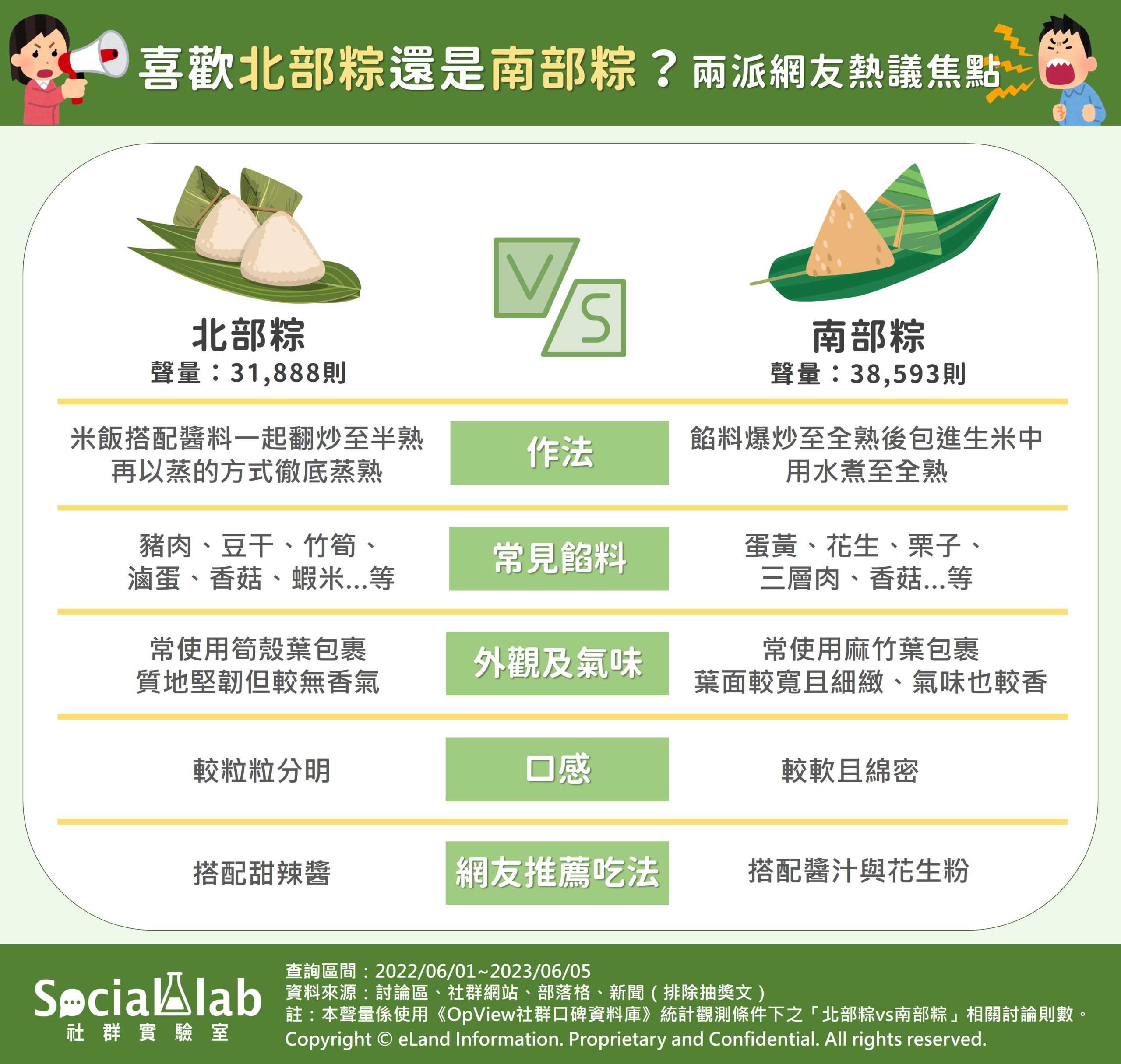 觀察2022年6月1日至2023年6月5日期間網路上針對「北部粽vs南部粽」相關話題的討論,發現每當有人問起南北粽的不同之處,最多網友提到的便是兩種粽子「作法」上的差異。