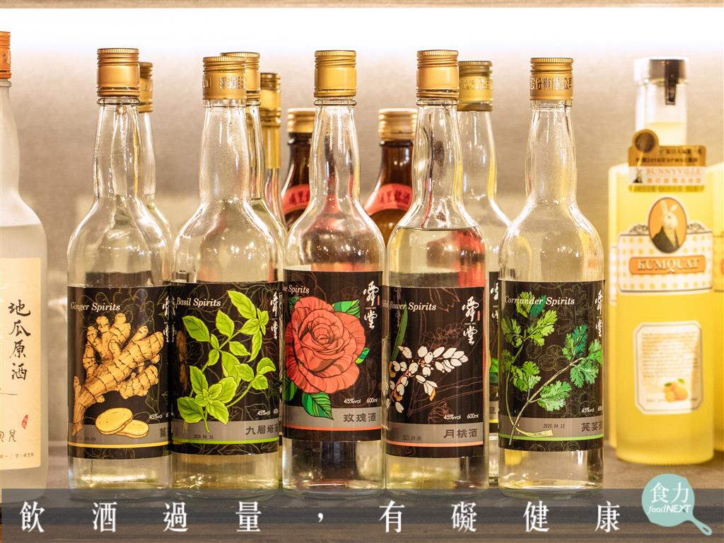 台灣地酒的釀酒原料多元,地瓜、水果、花卉、生薑、九層塔與香菜等都可入酒,獨特香氣用來製作成調酒,單飲或搭配料理都適合。(張偉明攝)