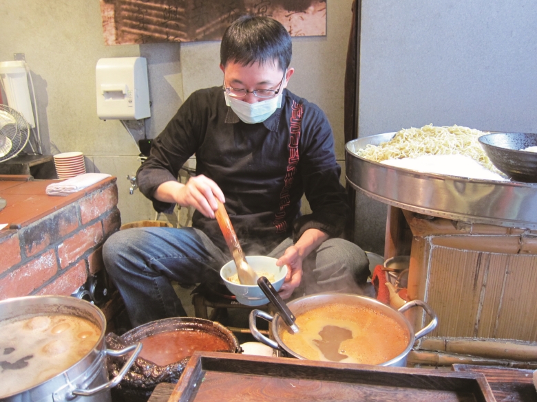 我們可以觀察到,幾乎所有麵食都是站煮,台南擔仔麵卻是少見的坐煮。擔仔麵之所以坐煮,可能跟它麵條的份量與種類有關,麵量少(約50公克,一般日本拉麵約150至250公克),因此不需像日本拉麵那樣站著用力甩除麵裡殘存的水分,加上擔仔麵用的是鹼麵,鹼麵本身就是熟麵,只要稍微在熱水中「摵摵(上下用力搖晃)」就可以。