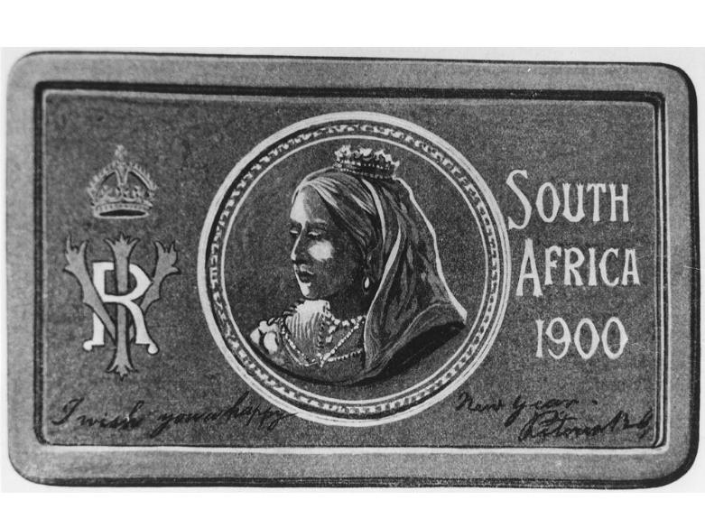 這盒巧克力被裝在錫製的盒子裡,盒身標有「南非 1900」、「祝你新年快樂」的字樣,還有英國維多利亞女王(Queen Victoria,1819-1901)的標誌與肖像。