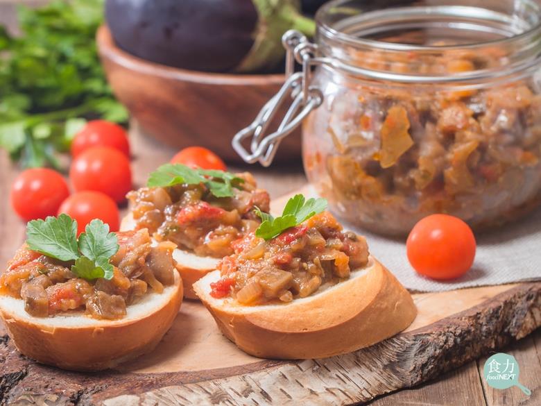 取2大條茄子,放入高溫的烤箱烤到軟。烘烤的時間端看茄子大小而定,差不多要45分鐘(也可以把茄子用水煮到軟)。將茄子皮剝掉,把茄肉搗爛,加入油、檸檬汁或醋、鹽以及些許胡椒和紅椒粉,用叉子來回畫圈,徹底碾壓成質地滑順的細泥。細茄泥做好後,將大顆生洋蔥切得非常細,再剁成碎末,拌入確實放涼的茄泥中。