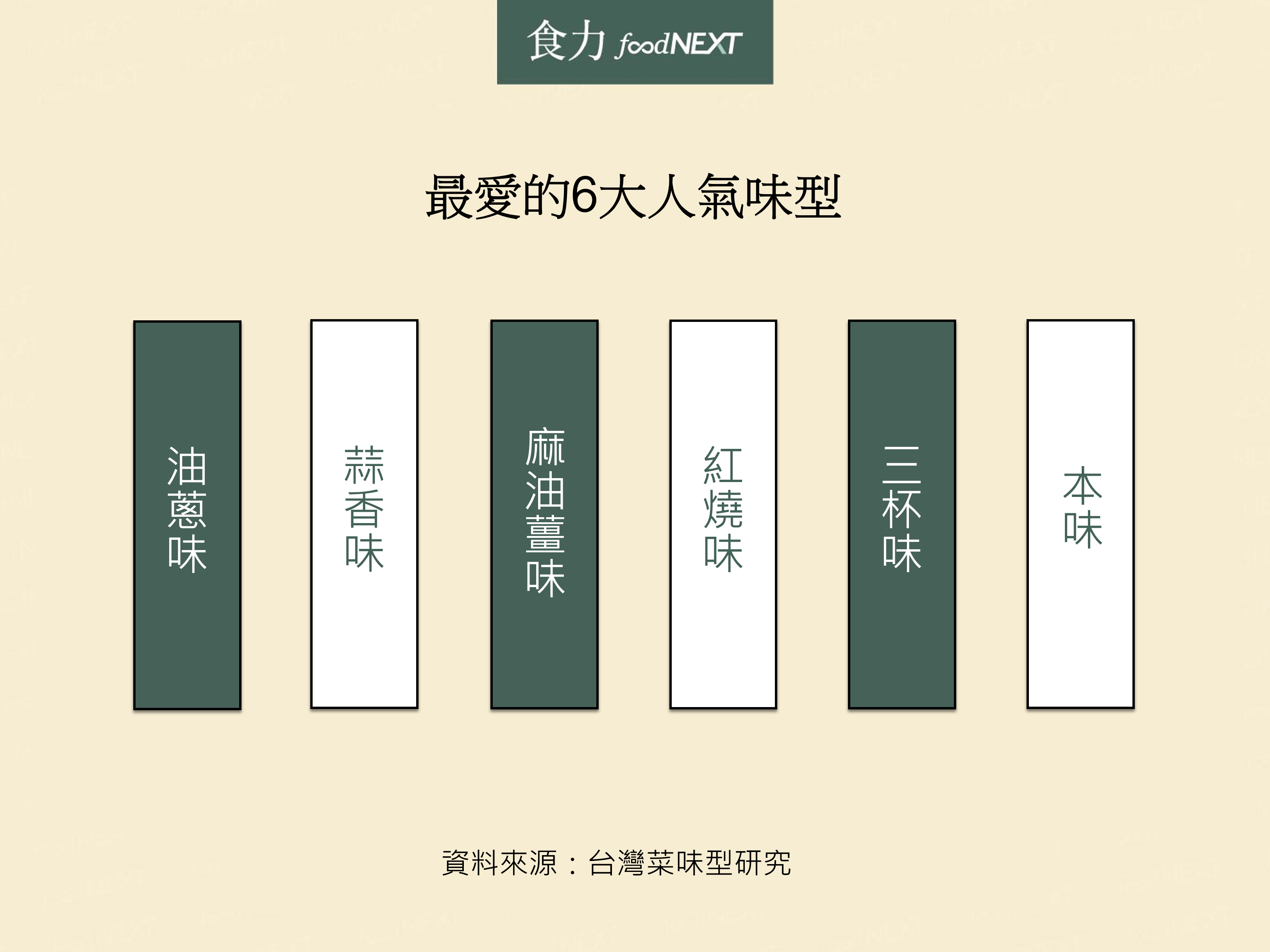 台灣菜味型研究統整了17種味型,且對民眾進行問卷調查發現,台灣人很愛食材原味,而最有台灣菜特色的味型是三杯、麻油薑和油蔥味。
