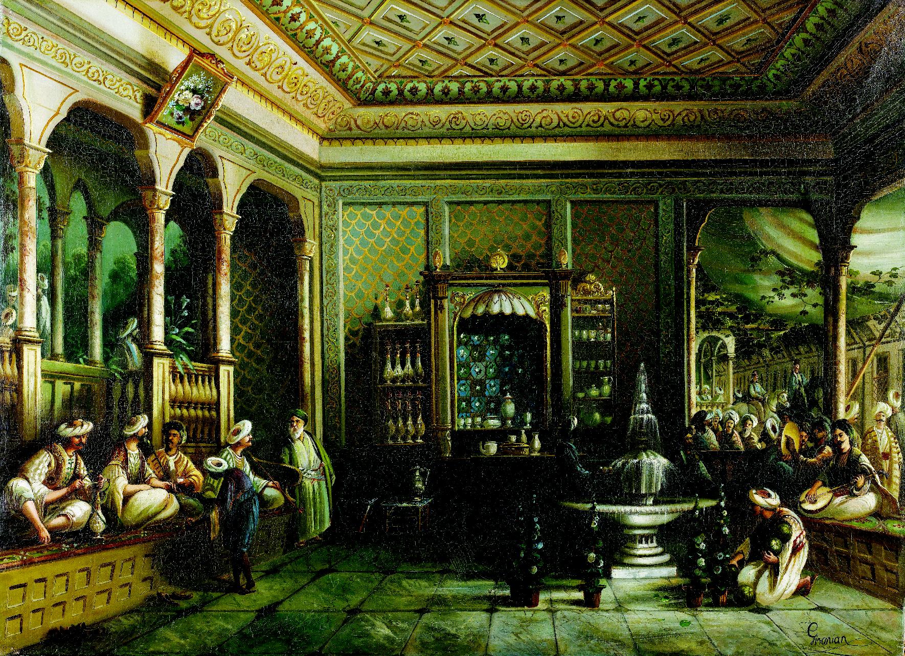 奧斯曼畫家奇凡尼安(Megerdich Jivanian,1848~1906)的《托芬的咖啡館》(A Coffee House in Tophane)。奧斯曼帝國境內的咖啡館除販售咖啡外,亦提供水煙,是男子社交的場所。(圖片來源:三民書局提供)