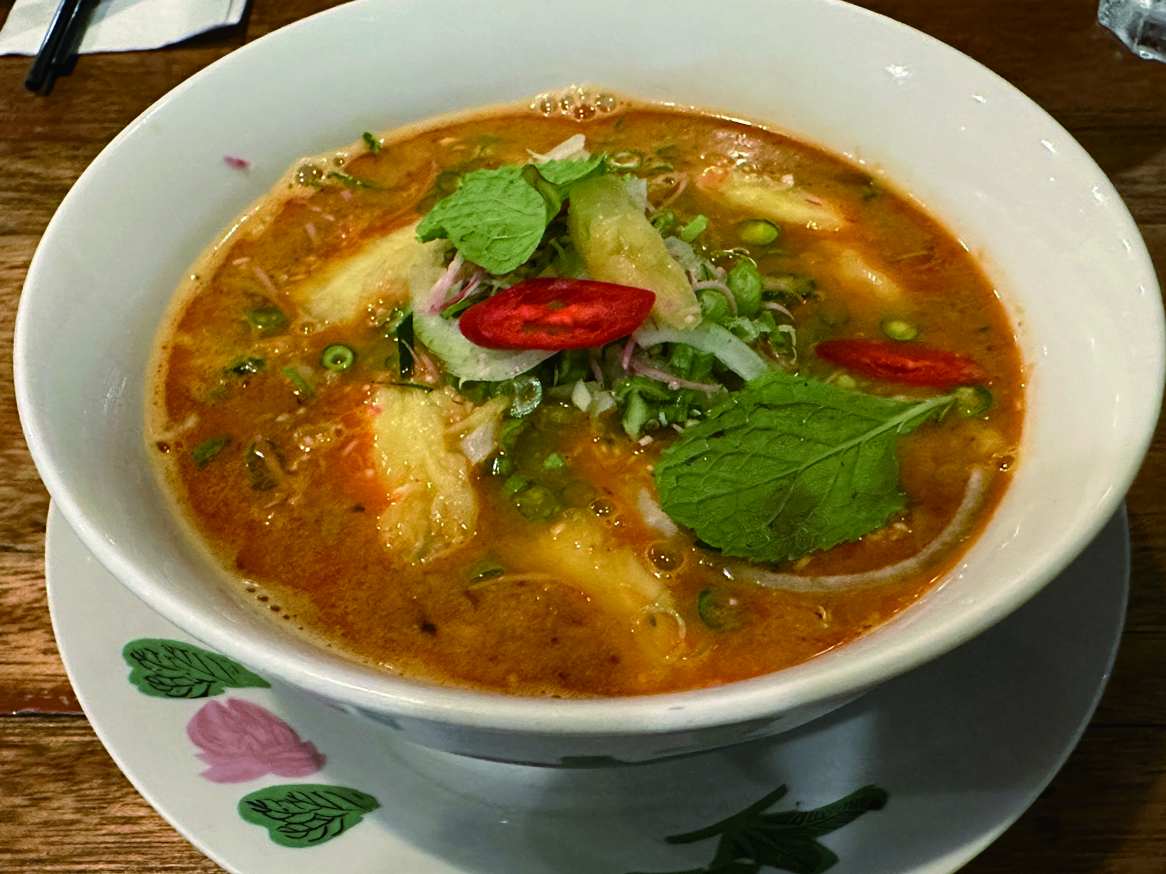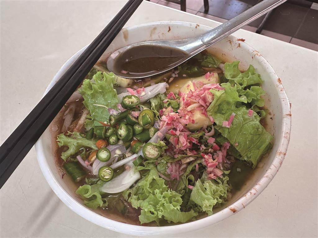 繼續北上,抵達與泰國邊界接壤的四個州,歷史上他們曾經是暹羅藩屬,口味喜愛酸辣,多用香草植物,於是,玻璃市(簡稱玻州 Perlis)和吉打州(Kedah)便出現了「暹羅叻沙」(Siam Laksa)。有意思的是,這款叻沙既想加羅望子增酸、又想添椰漿增稠,風味組合上這兩者本是相互牴觸的關係,如何拿捏平衡、做出好湯頭永遠是艱鉅考驗。