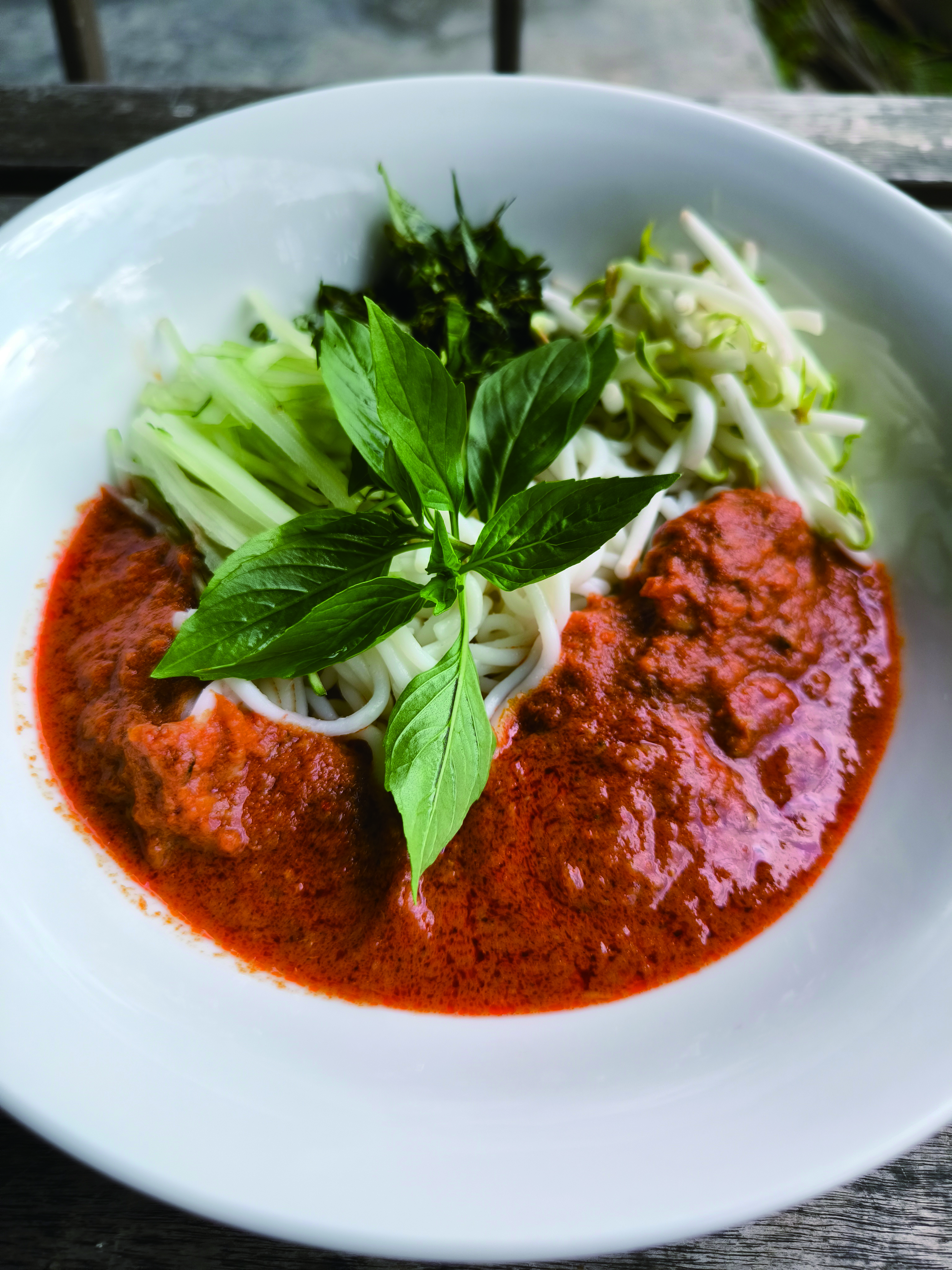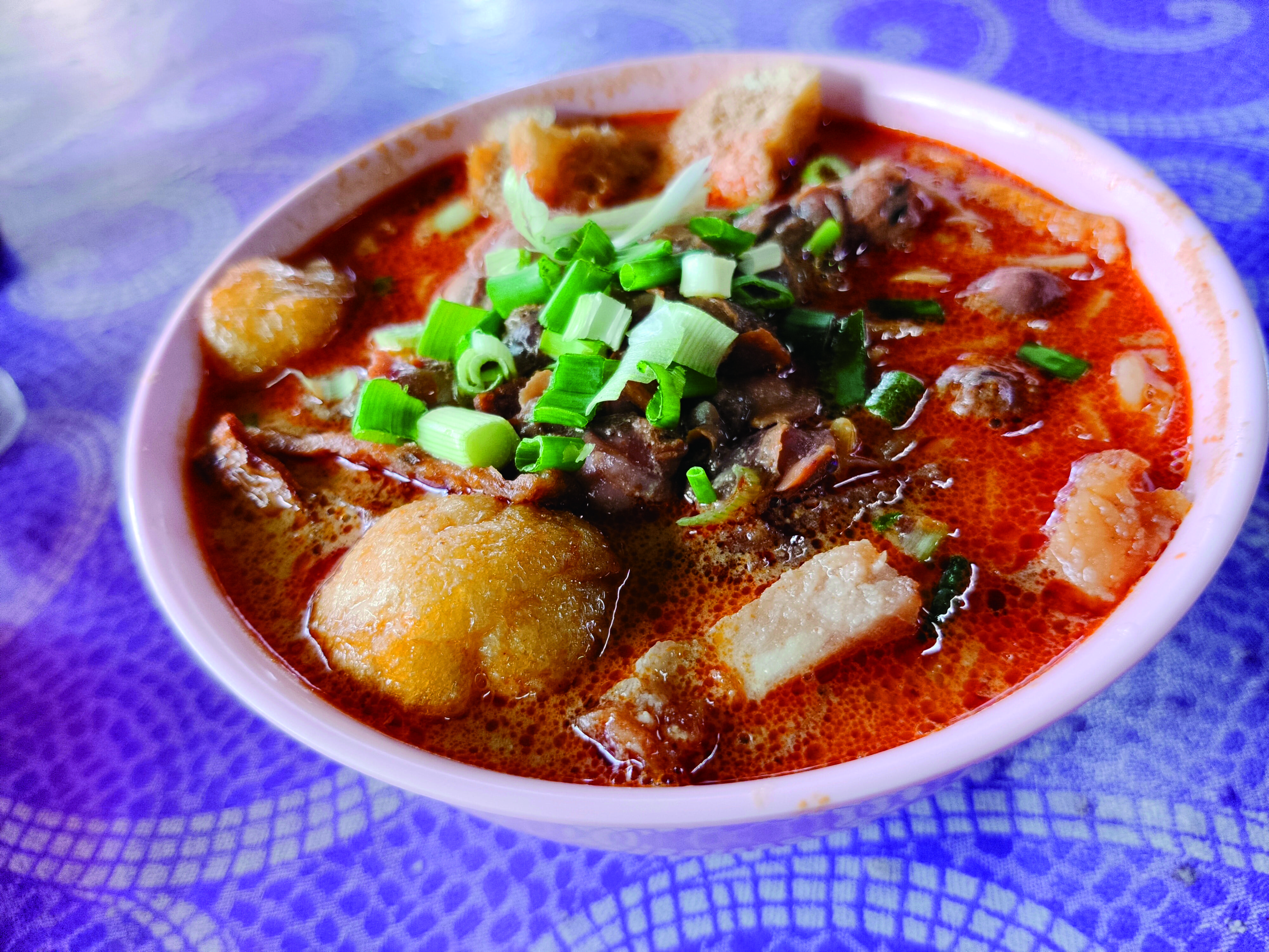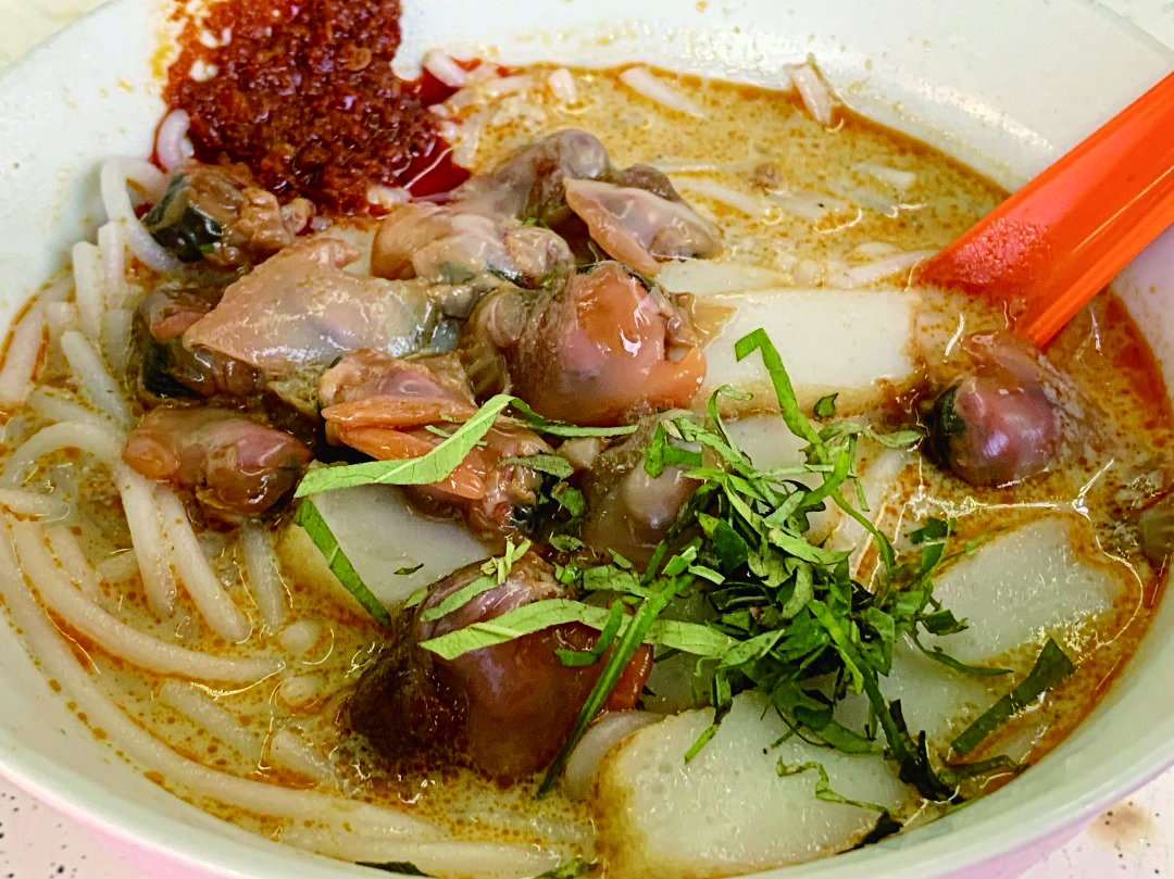 往北輻射,沿著西北部海岸繼續延伸,則發展出「咖哩叻沙」(Curry Laksa),在檳城稱之為咖哩麵。一道食物能歷經不同族裔之手,一次次吸收、組合、再創,足以證明它廣被喜愛和接納。這款檳城咖哩麵的風味最接近華人手法,辛度較低,香氣多層次,且充滿椰漿濃郁感;配菜也甚有意思,裡面有潮汕人標誌——血蛤(Tegillarca granosa),還有油泡(大馬稱豆卜)吸收湯汁精華。檳城在二 八年被列為世界文化遺產後,遊客蜂擁而至,另一款「白咖哩麵」(White curry mee)突然出現,強調來自椰漿的白湯底,風味讓人驚豔。