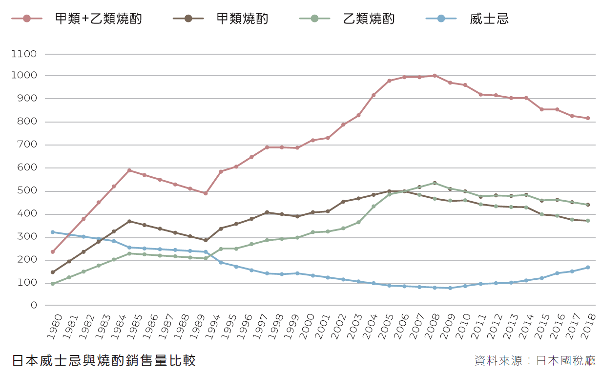 1980年代的日本飲酒市場出現明顯轉向。原本被視為平價、粗糙的本土燒酎,靠著過濾技術改良與罐裝調酒(Chu-Hi)等產品創新,成功撕掉「廉價感」標籤,在短短幾年內銷量就逆襲超越了威士忌。加上當時酒稅制度使威士忌相對處於劣勢,以及朝日啤酒憑藉清爽的「Dry」系列異軍突起,讓日本人的口味從濃烈轉向清爽易飲,這場轉向也奠定了今日日本隨處可見的罐裝調酒與乾爽系啤酒的消費基礎。