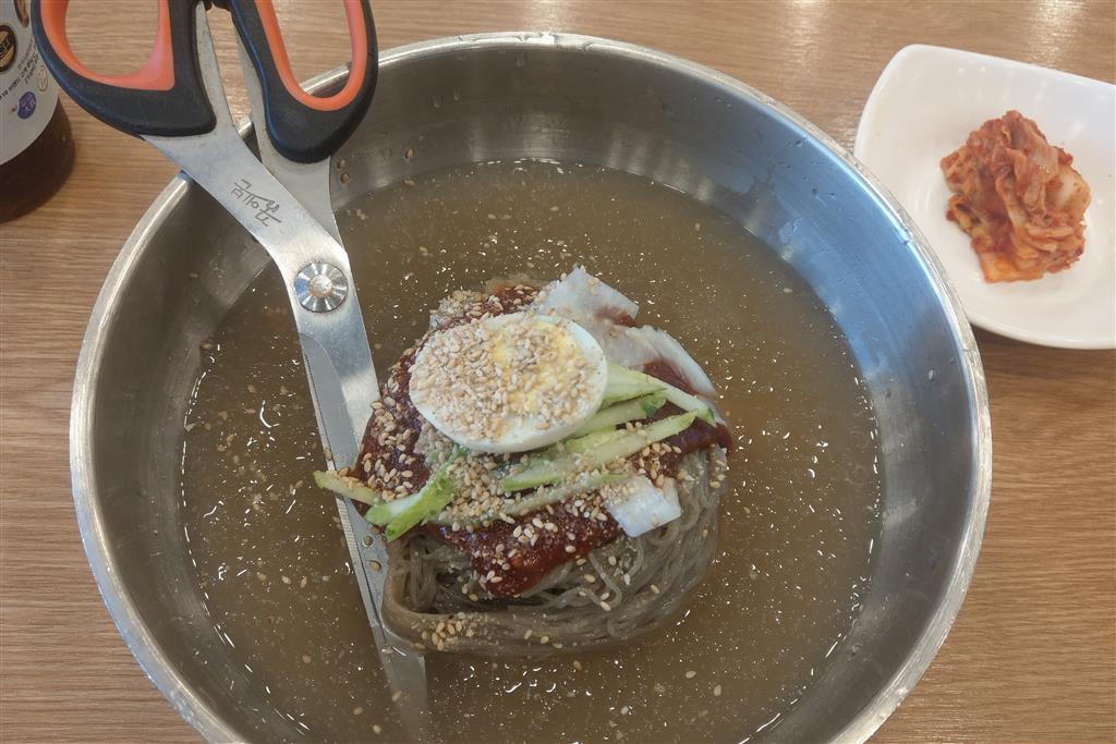 介紹完日、韓冷麵的麵條、醬汁與製作方式的差異後,私想大家對冷麵印象最深刻的還有「食用器具」之別吧。有時我們到韓國的冷麵餐廳,服務生隨餐會附上一把大剪刀,方便客人用來剪斷碗內麵條,這樣的大剪刀少見於蕎麥冷麵餐點中,而是使用在有著肉汁高湯的「咸興冷麵」(함흥냉면;咸興冷麵起源已久,直至1953年才有首爾店家採用此麵名)上,之所以要使用到這把大剪刀,也與麵條有關。