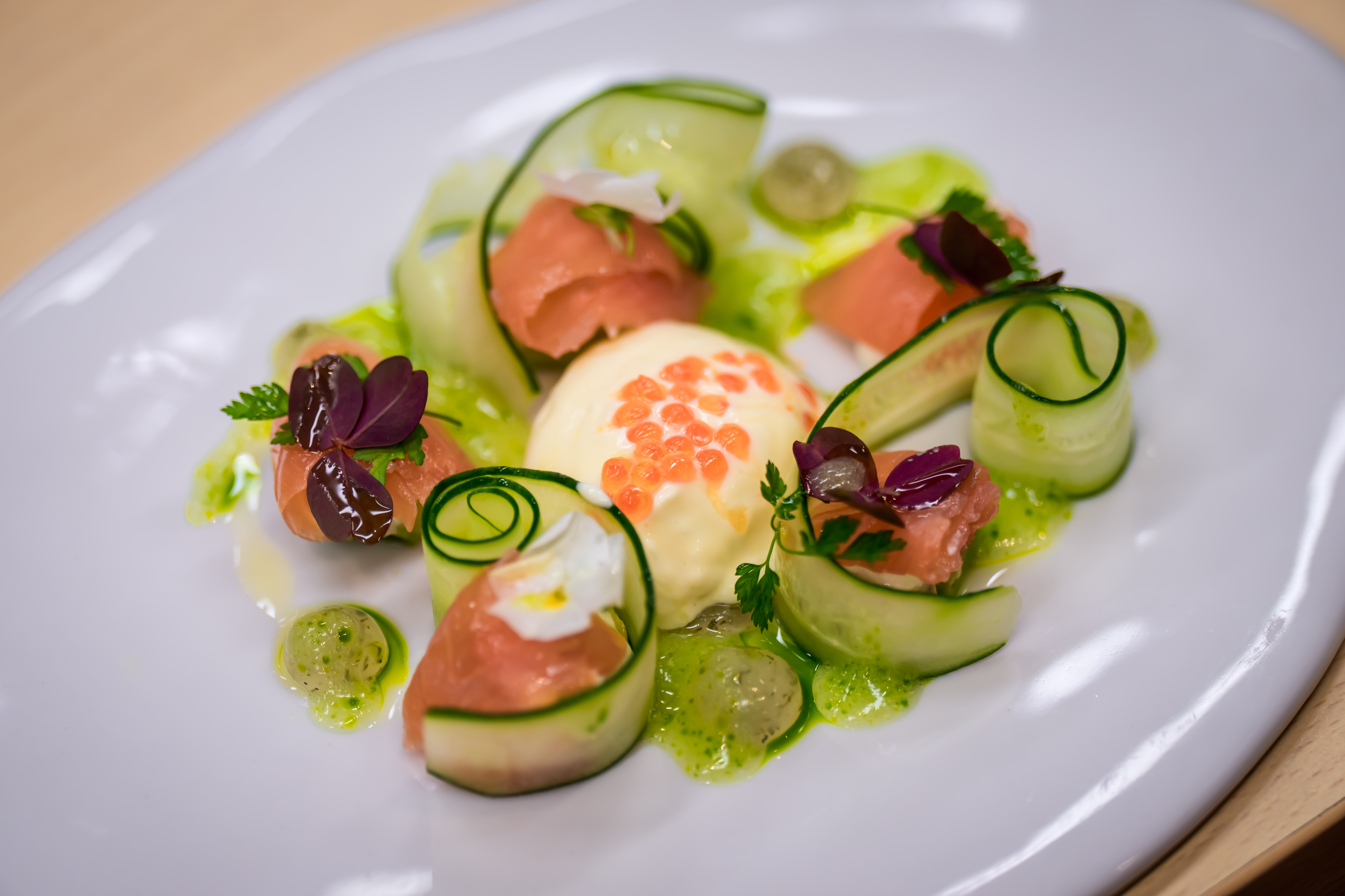 第1道「柑橘鮭魚沙拉搭配帕達諾乳酪冰淇淋」,選用較年輕的乳酪製作。鮭魚以鹽、糖與柑橘醃製,搭配黃瓜冷湯與鱒魚卵,整體風味清爽而明亮。其中最令人驚艷的是以乳酪製成的冰淇淋。林耀輝解釋,將乳酪轉化為冰淇淋形式,是希望降低接受門檻,讓乳酪能更自然地融入日常飲食,同時也打破義大利料理中「海鮮不能搭配乳酪」的傳統框架,展現更開放的料理思維。