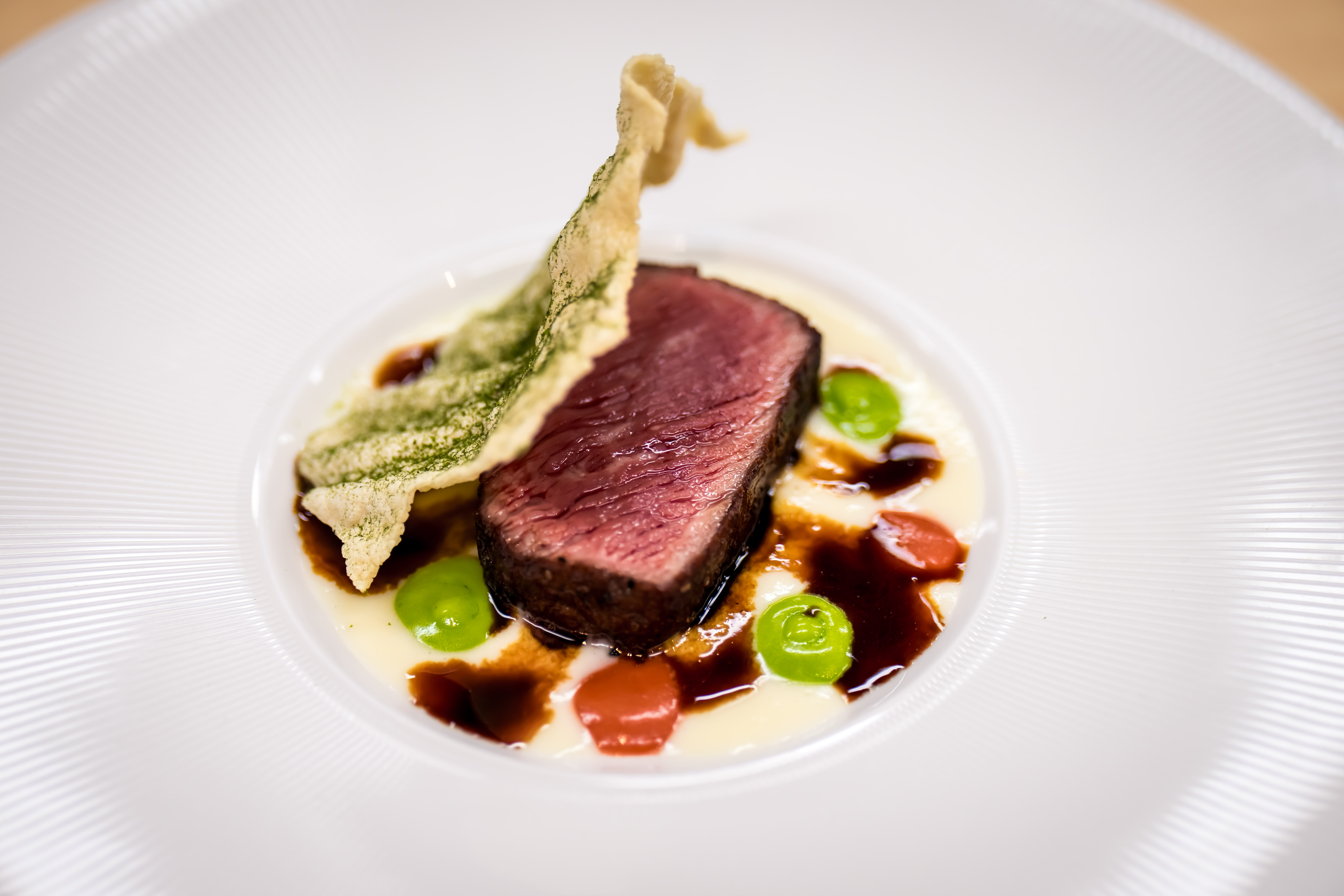第3道「帕達諾乳酪經典義式手切牛排搭配3種元素醬汁」,結合傳統與創意,以芝麻葉、番茄與乳酪3種元素構成經典醬汁,同時將乳酪外皮加以利用,熬煮成高湯後再延伸製作為米餅,將食材價值發揮至最大,也展現零浪費的料理思維。