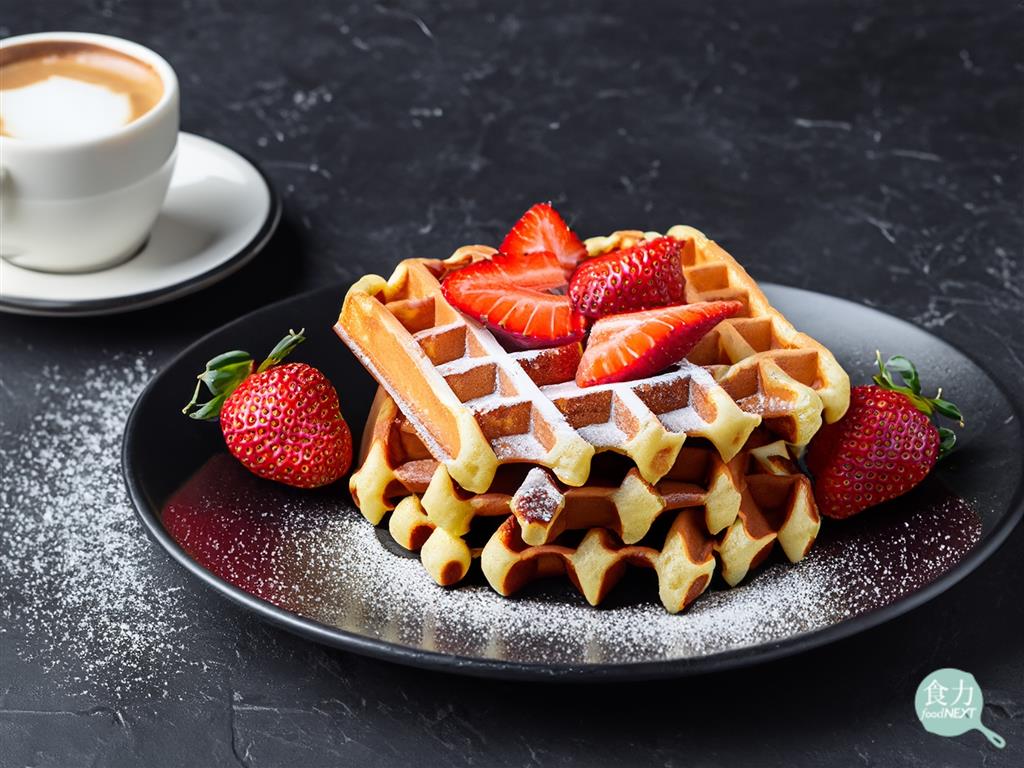 四角形的格子鬆餅外酥內軟,會搭配奶油和水果等佐料一起食用。