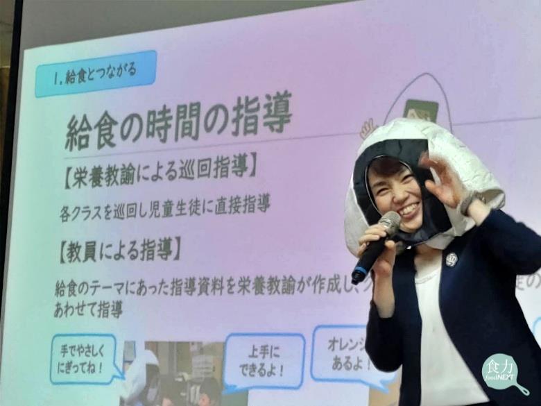 頭上戴著御飯糰的頭套、親自唱著自創的「捏飯糰歌」的櫻川朗江,是來自日本福井縣「南越特別支援學校」的營養教師,專門針對5至18歲因為身心障礙的幼兒童及青少年學生更能理解對話內容、接受飲食教育,櫻川朗江說,使用視覺化且正向具體的指示,學童才能想像和接收訊息。因此她戴上飯糰頭套、創作有擬態語句的歌詞,學生們就能注視著她,學習製作飯糰的方法。