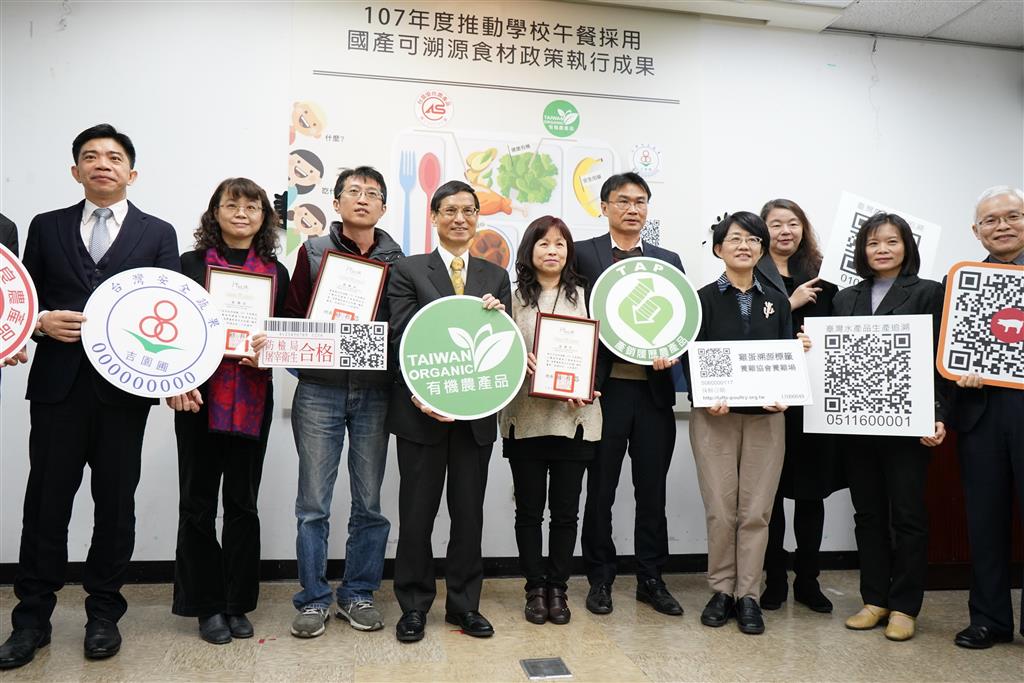 推動學校午餐採用國產可溯源食材政策,於107學年度第1學期開始,由全國22縣市辦理,至2018年11月全國22縣市之午餐食材具標章(示)之登錄筆數占比已達55%,其中新竹市、台東縣及台南市之學校午餐更已超過70%,對於學校午餐食材源頭管理已有顯著成效。為表揚各直轄市、縣(市)政府配合本政策,行政院政務委員林萬億特頒感謝獎狀予新竹市、台東縣及台南市政府,並請教育部及農業委員會(簡稱農委會)參考各界提出之建議,作為2019年度政策執行方向。