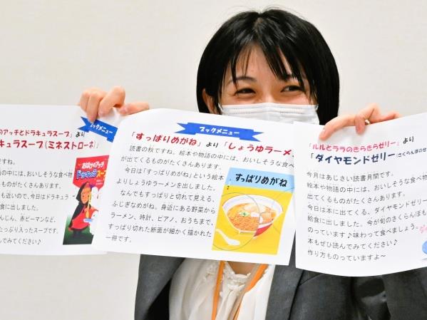 日本的食譜特色在於著重在地食材的選用,餐點中常有當地農漁產品,並且強調「和食」文化,例如碗筷如何使用,甚至是器皿擺放的位置都有所講究,對用餐禮儀十分注重。此外,日本也推廣「食魚教育」,教導學生怎麼用筷子分解魚、將魚吃得乾淨,並針對營養價值進行菜單調整,例如雜糧入菜補充礦物質,或將學生不愛的食材如菇類、青椒,思考如何在料理上有所變化,使學生接受度提高,方方面面都投入許多心力。