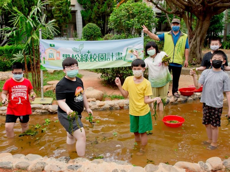 霄裡國小師生體驗校園埤塘的水生植物種植,右三為台灣濕地復育協會吳聲譽老師,右四為霄裡國小古艷麗校長。