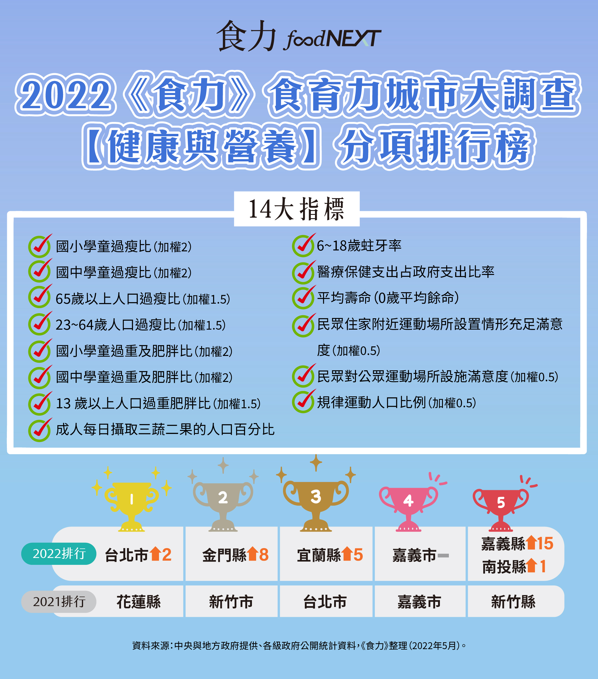 《食力》針對體位、飲食攝取、口腔保健、壽命及運動等健康與營養相關公開數據指標做全台大評比,究竟誰是健康好寶寶城市?2022食育力城市大調查「健康與營養」指標中由去年第3名的「台北市」拿下分項指標冠軍,第2名及第3名分別是今年首次入榜的金門縣、宜蘭縣,嘉義市維持第4名,第5名則由嘉義縣、南投縣並列。