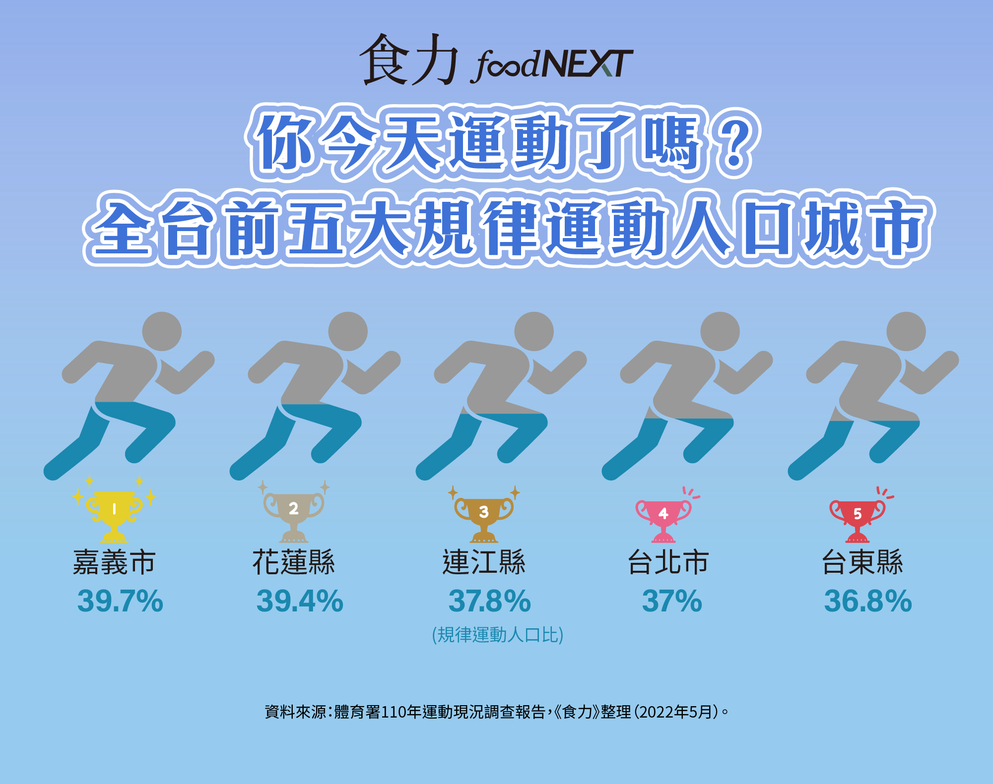 「2022食育力城市大調查」由台北市拿下「健康與營養」構面的冠軍。養成健康體位是食育中重要的一環,不論過瘦、過重或肥胖都屬於營養不良的一種。而平常養成規律運動習慣更是對於健康體位養成的重要最後一哩路。