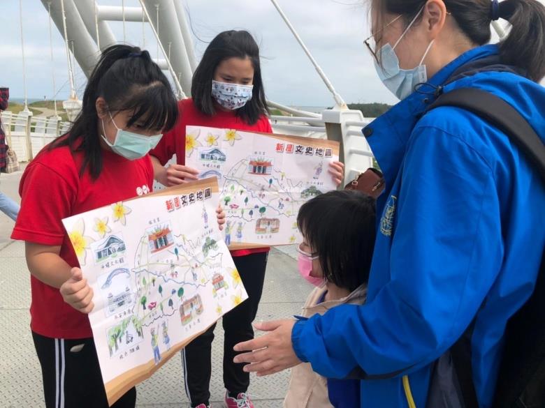 六年級學生也在永安海螺文化體驗園區推行「i鄉推播客」計畫,贈與遊客手繪的新屋文史導覽地圖,並結合APP,介紹自己的家鄉,成為家鄉最佳代言人。