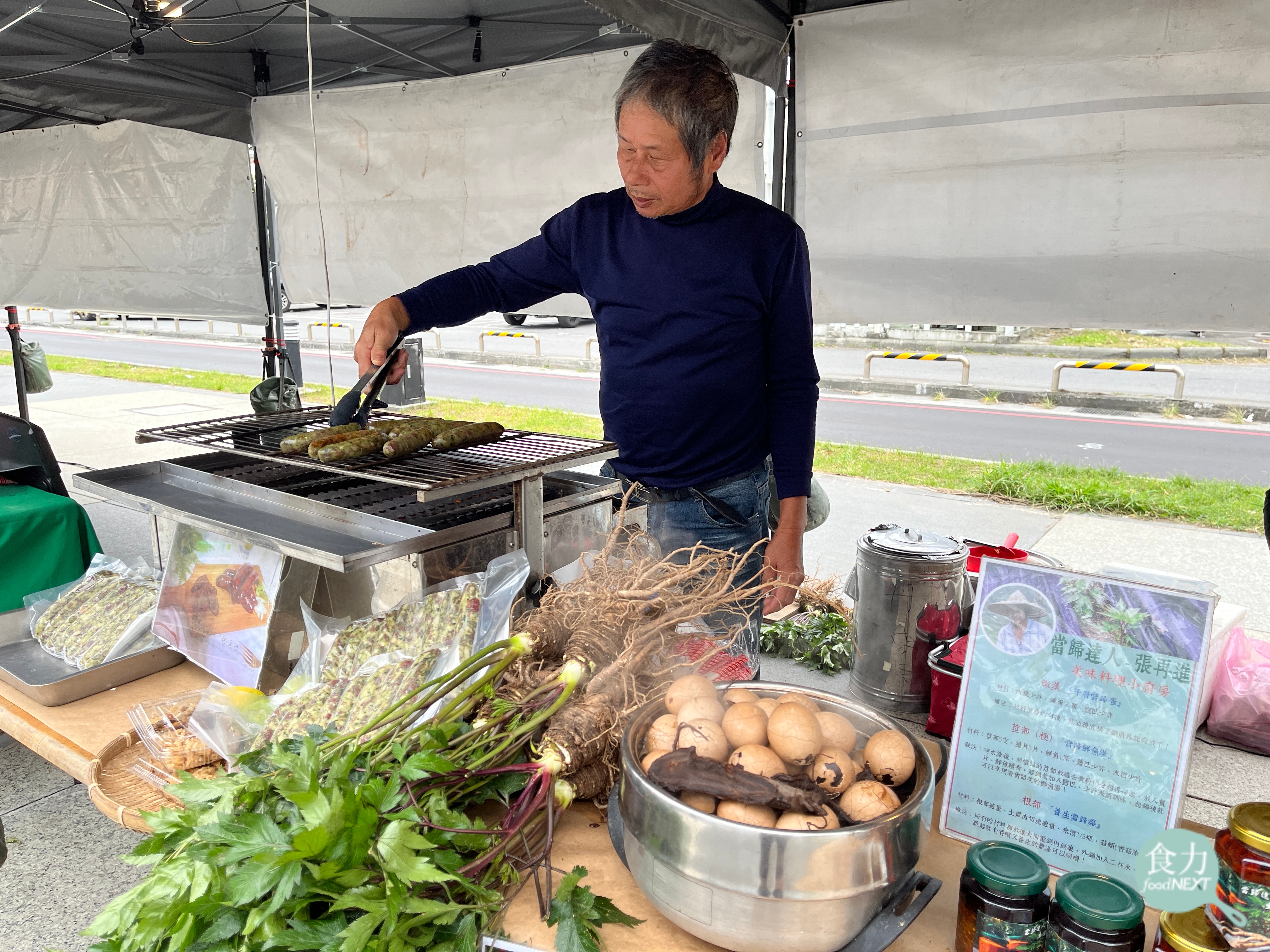 張再進在花蓮食農博覽會販售當歸香腸與茶葉蛋,示範新鮮當歸與丹蔘的料理方式,當歸葉子煎蛋、根鬚煮湯,丹蔘可做茶飲。透過料理重新詮釋中草藥,讓原本只存在中藥房的素材,重新被現代家庭與餐飲端接受。(林玉婷攝)