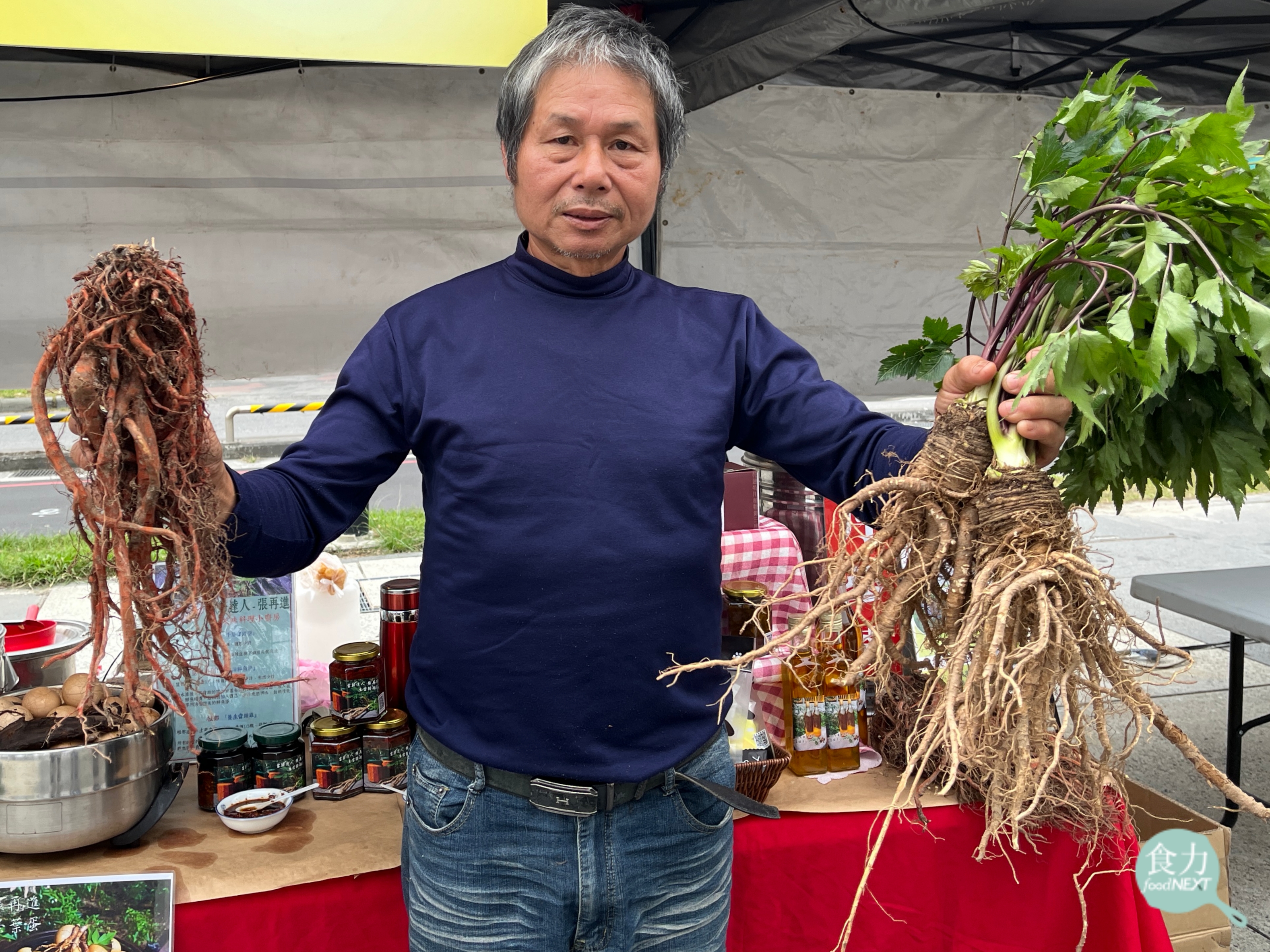 被譽為「當歸達人」的張再進,手握親手種植的大和當歸(圖右)與丹蔘(圖左),有別於中藥行常見多由中國進口的乾燥藥材,新鮮中草藥的運用性更廣。(林玉婷攝)