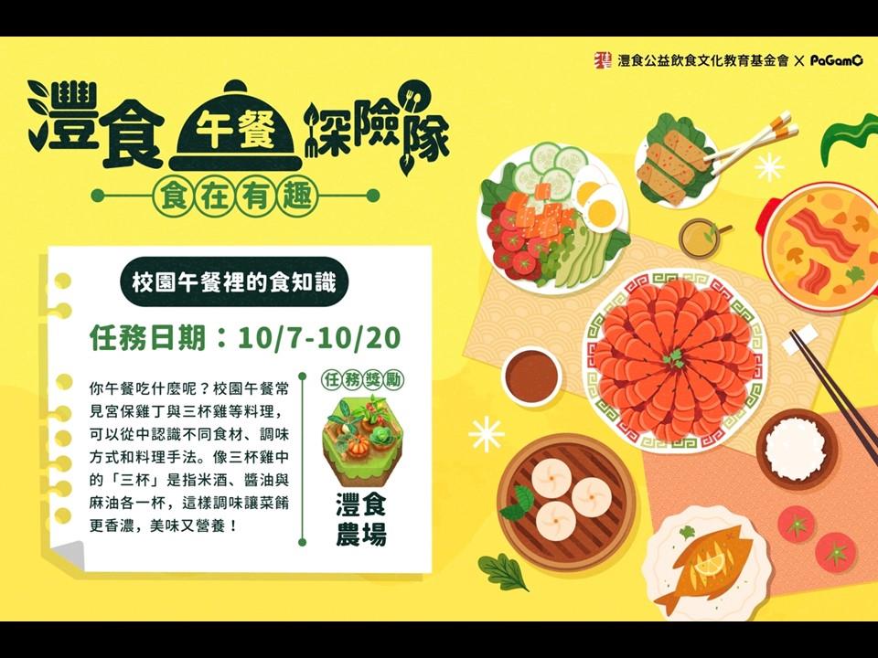 你知道校園營養午餐其實有豐富的知識內涵嗎?灃食公益飲食文化教育基金會(簡稱灃食教育基金會)再度攜手PaGamO遊戲平台,推出全新任務「校園午餐探險隊」,邀請全台學生從午餐菜單出發,探索豐富在地飲食文化。