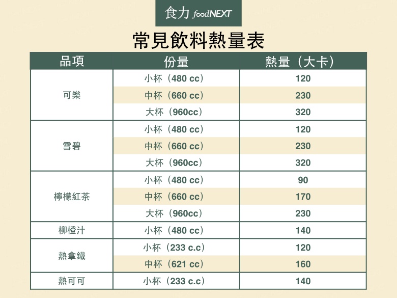 除了爆米花是看電影標準配備,選好口味後想起單吃爆米花嚥不太下,選杯飲料搭配時,除非自己有帶水,或您想選擇零卡可樂、無糖綠茶等,否則就又是另一筆熱量的加成,以下是基本款飲料的熱量,供您參考。