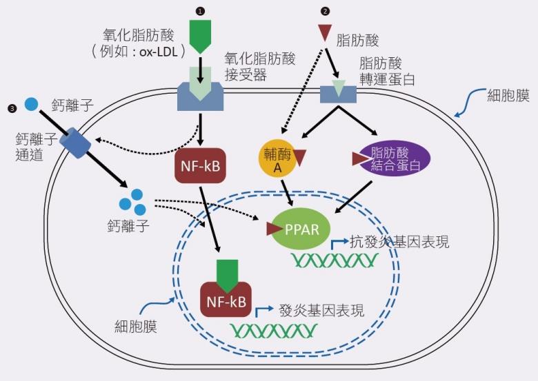 2.氧化脂肪酸透過細胞膜上的接受器,影響下游的信息傳導,最後影響基因表現。