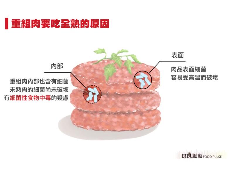 重組肉是將多塊肉重新拼湊成完整的肉排,或絞打製成絞肉,加工時已接觸外界細菌的區塊被混入肉排內部,可能導致細菌性食物中毒,只有加熱至全熟才能充分殺菌。