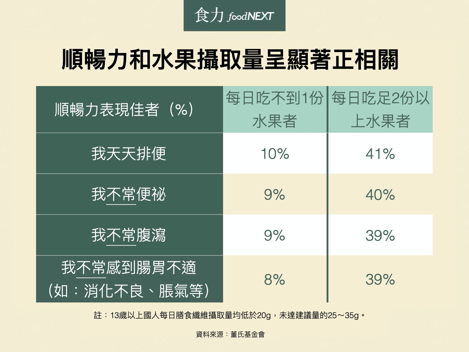 2020年2月董氏基金會進一步針對台灣15~69歲國人進行身體快樂指數網路調查,共收回有效問卷1068份,問券內容詢問民眾關於排便、便秘、腹瀉、腸胃不適等順暢力相關問題,結果發現順暢力和水果攝取量呈顯著正相關,且順暢力表現佳者每日吃足2份水果者是吃不到1份者的4倍。