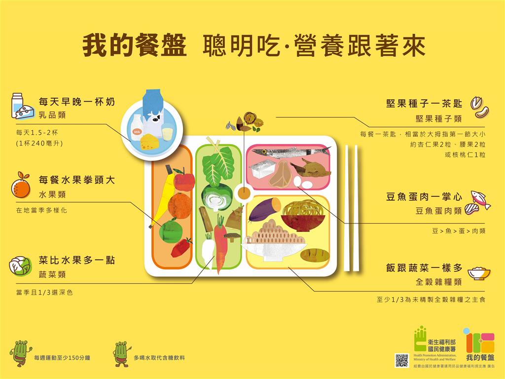 國民健康署於2018年公布「我的餐盤」圖像,將每日應攝取的6大類食物:全穀雜糧、豆魚蛋肉、蔬菜、水果、乳品與堅果種子以圖像呈現,並設計6句簡易口訣,讓民眾利用拳頭、掌心即可暸解每餐6大類食物要吃的量。