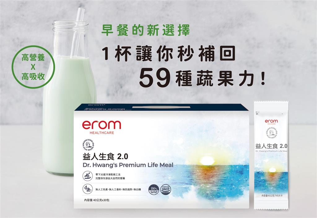 erom益人生食2.0承襲韓國生食理念推動者黃聖周博士 27 年的研究精神,倡導「吃回食物的本質」。透過冷凍乾燥技術,將超過50種天然穀物、蔬果、堅果、菌菇與海藻完整保留在一杯飲品之中。erom益人生食2.0堅持「非萃取、全食物」的原則,以天然、多樣化的飲食方式,打造出現代人便利且安心的高規格綠拿鐵。無需削皮、洗切,只要三秒即可沖泡,讓「好好吃東西」在快節奏生活中也能輕鬆做到,對於外食族來說,更是救星般的存在。