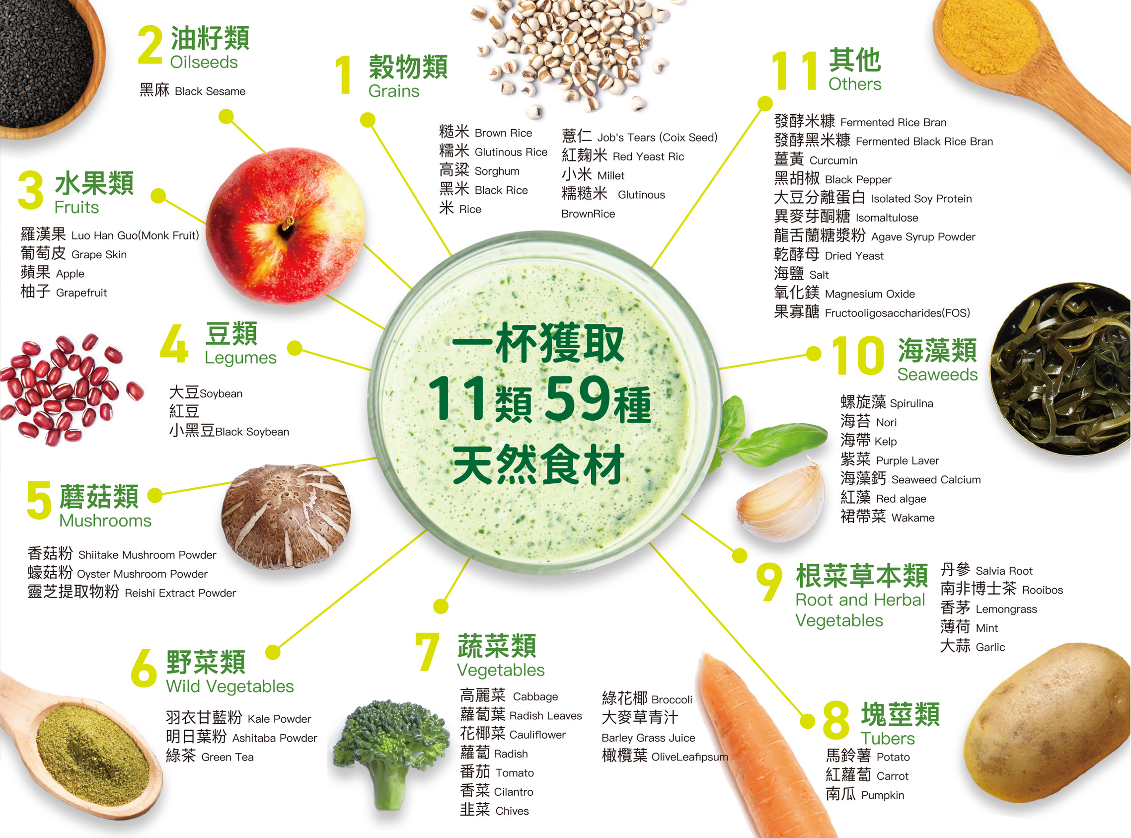 1、食物多樣性:涵蓋全穀物、蔬果、菌菇類、海藻等超過 50 種天然食材的混合配方,提供人體所需營養。