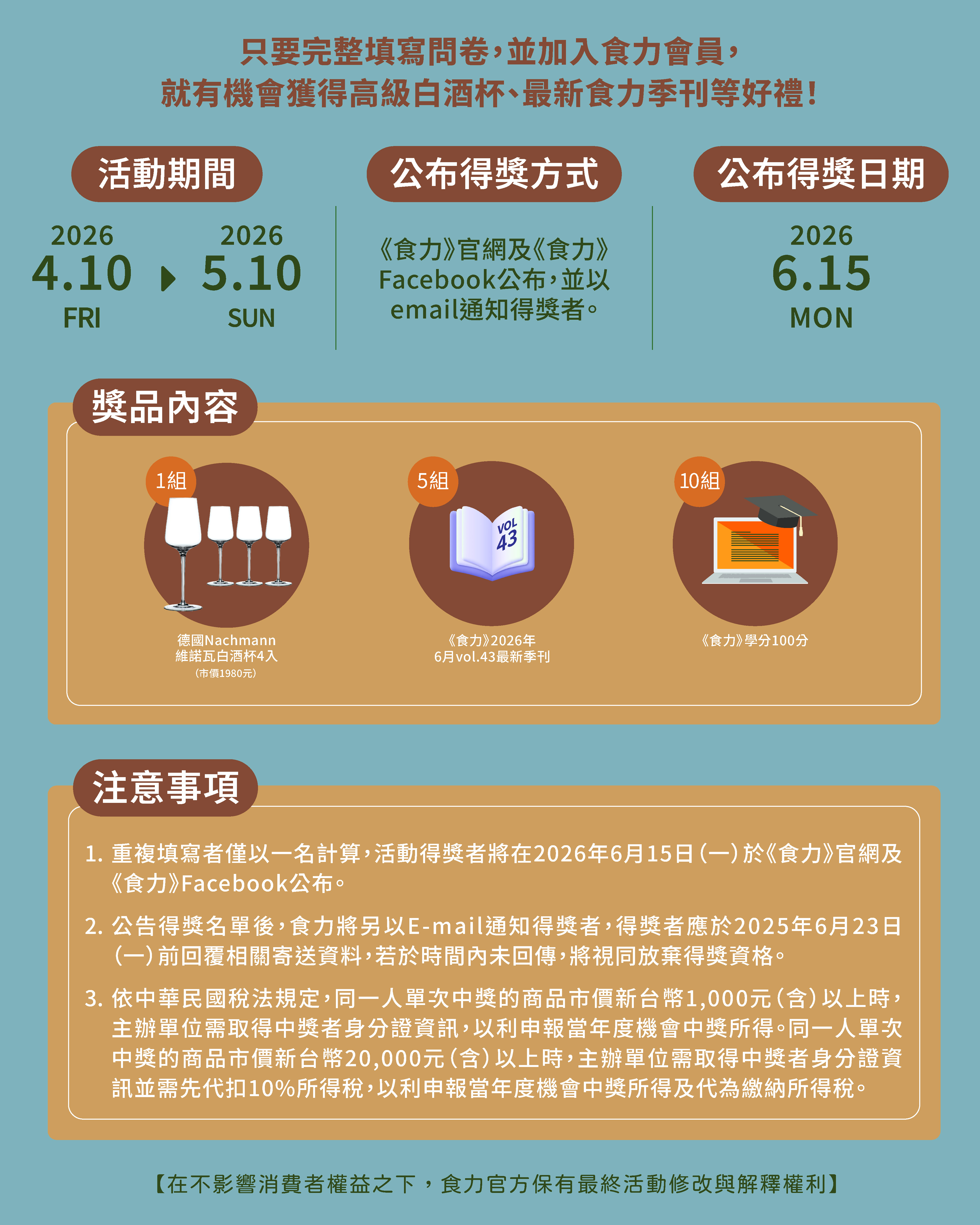 《食農教育法》推動後,食農教育逐步走入校園。隨著政策進入推動中期,本問卷希望了解教師在實際教學現場中,是否感受到資源與支持的變化,以及這些條件是否有助於食農教育的落實。本問卷調查由《食力foodNEXT》傳媒主辦,台灣兒童食育協會、康善基金會、食農教育點子膠囊、荒野保護協會協辦,為感謝教師人員協助填答,若加入食力官網會員,並在問卷中留下會員註冊email,我們將抽出高級白酒杯、《食力》2026年6月號最新季刊及《食力》官網100學分,贈送給加入《食力》會員的填答者以表感謝。