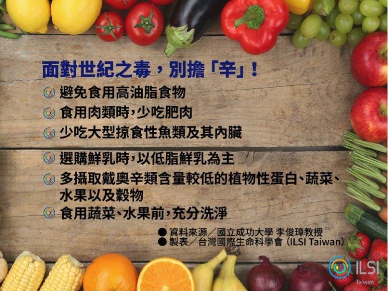由於戴奧辛類化合物為脂溶性化學物質,民眾若想降低戴奧辛類化合物的攝入,建議應避免大量食用含高動物油脂食物,並減少大量攝取大型掠食性魚類及其內臟等戴奧辛化合物含量較高的食物;食用肉類時少吃肥肉;選購鮮乳時,盡量以低脂鮮乳為主;並且多攝取植物性蛋白(例如豆腐、豆類食品等)和蔬菜、水果、穀物等食物,食用蔬菜、水果前,充分洗淨。