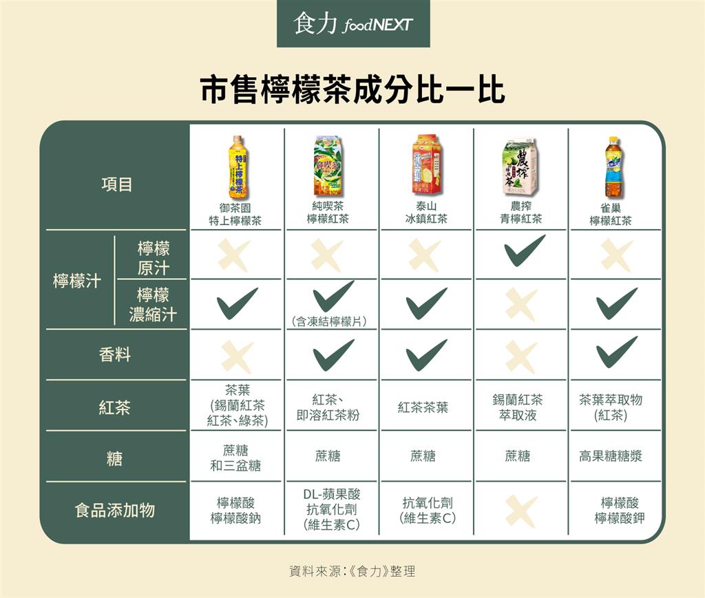 比較市售常見的5款檸檬茶品,由成份表可發現,多數使用檸檬濃縮汁,此類型的茶品,如冰鎮紅茶等,尚需加入檸檬酸、蘋果酸與香料,調整使味道更加濃郁均衡。選用檸檬原汁製作者,僅「農榨青檸紅茶」一款,不需添加調味劑來調整酸味與香味。