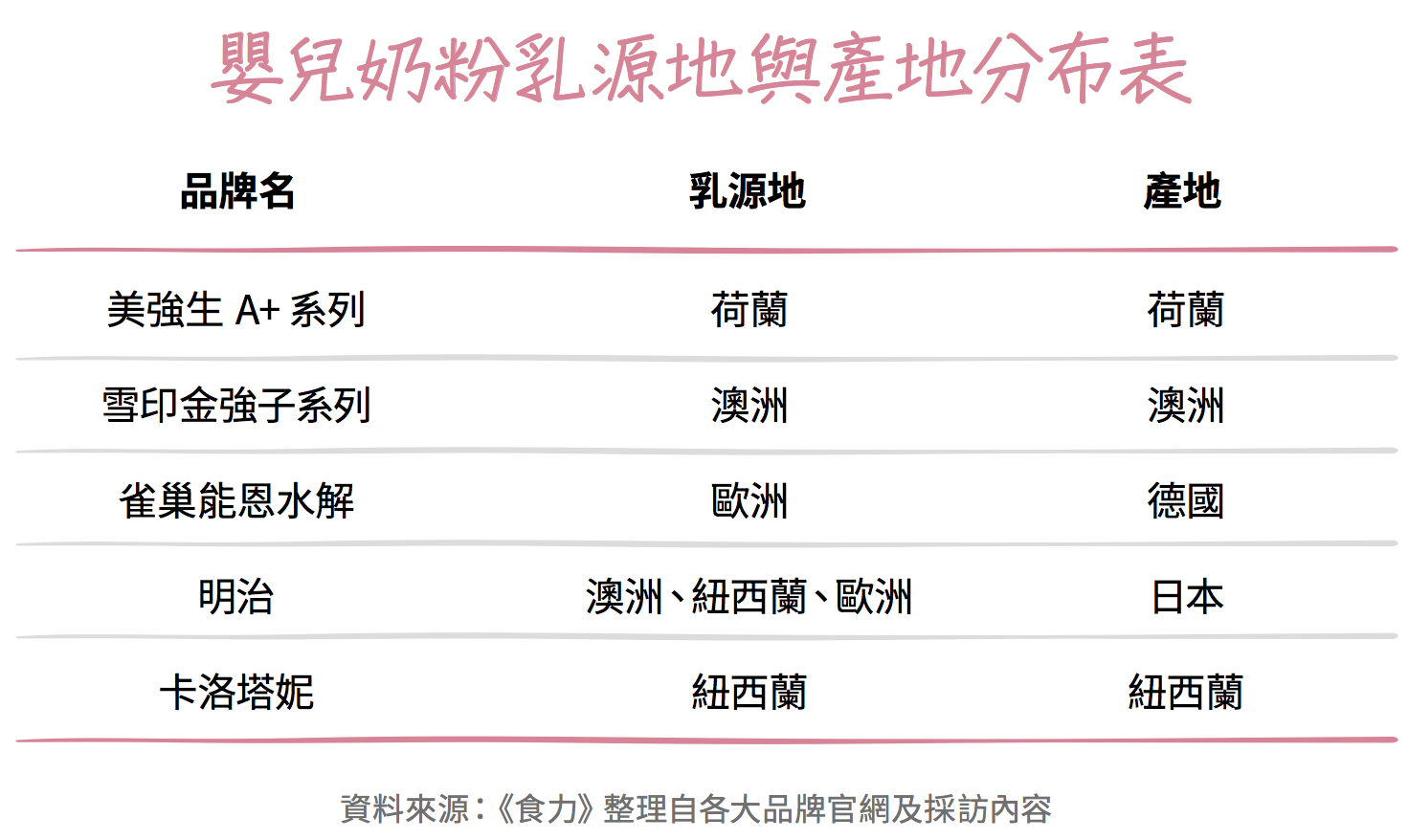 台灣嬰兒奶粉目前主要以國外原裝進口為主,指在國外經由生產製作且裝罐完成後再送至台灣,《食力》調查目前台灣各家嬰兒奶粉業者的產地標示,包含紐西蘭、澳洲、荷蘭、瑞士以及愛爾蘭等,嬰兒奶粉的進口產地分佈情況,其實也反映了業者及消費者喜好。
