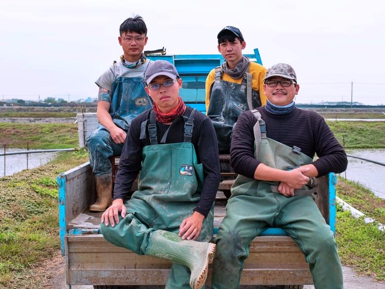 從漁人隊到漁創客,張博仁(右一)在彌陀培力養殖漁業青年生力軍,在魚塭旁開立的青創基地交流平台「漁創客」,提供彌陀在地就業與創業契機。(張語屏攝)