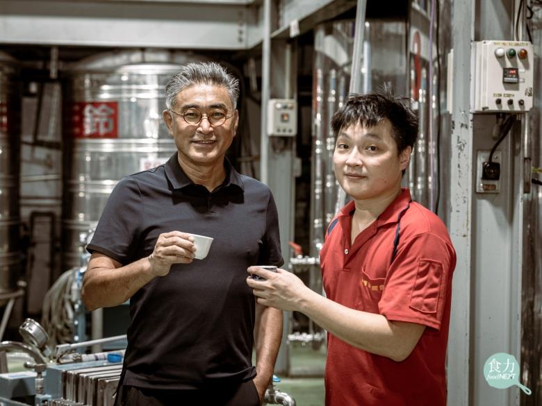 霧峰農會酒莊釀酒師李政諺(右)赴日學習釀造清酒的作法,再回台鑽研釀出好的酒。