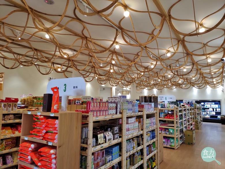 整家超市從天花板的客家意象斗笠編織裝置藝術到木質展示層架、簡潔的空間標識以及挑選過的燈泡亮度,散發溫馨靜謐氛圍,與通常被賦予科技前衛的「未來感」風格不同,范雅鈞說:「整家店使用的疏伐人工森林裡的柳杉,循環善用『台灣材』,永續才有未來,也為林業創造新的市場需求。」
