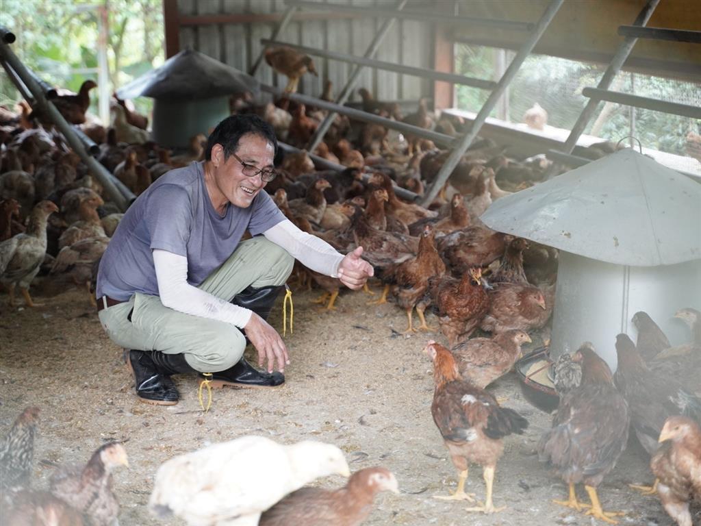 在縣府的協助下,張進義辦貸款重建農場,縣府安排專家學者到現場教他專業技術,他更積極學習,從防疫、行銷到人道飼養,哪裡有課就去哪裡上。多年努力下來,現在的鄉庭農場鬱鬱蔥蔥,5000隻雞在青山綠水間快樂生長,農場生產的放山雞和自然放牧蛋在無毒農產的市場上更供不應求。