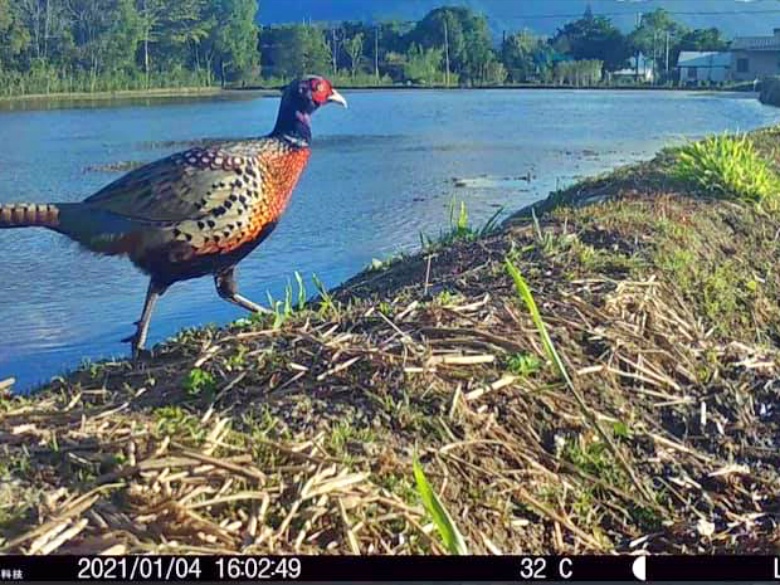 在田間出現環頸雉等珍稀鳥類,表示水稻田間友善,有良好生態環境與動物共存,讓魏瑞廷的米在送檢美國FDA認證時成為有力的證明、申請流程更快速。(圖片來源:魏瑞廷提供)