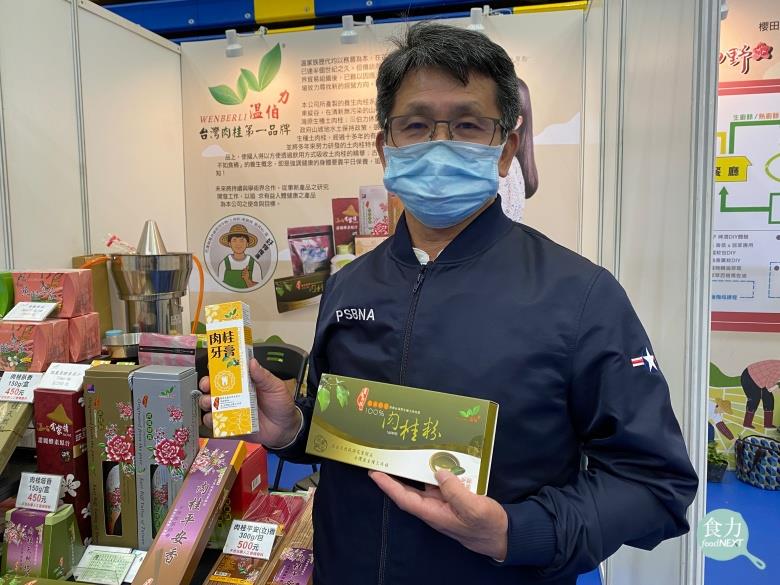 「2022花蓮食農博覽會」上,可看見温錦州將台灣土肉桂結合生物科技技術,打造出多樣肉桂口味的生活用品,包含肉桂薰香、肉桂洗髮乳、肉桂牙膏等。(謝承學攝)