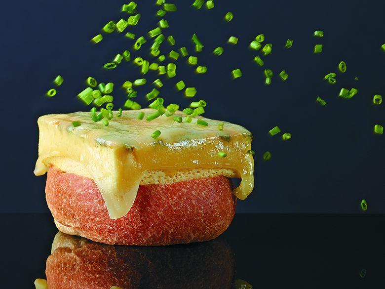 Step 2用鋸齒刀把麵包水平切開,下半部放在平烤盤上,放上烤炒蛋,上面放一片格魯耶爾乳酪。放入烤箱烤到乳酪融化,約4分鐘。