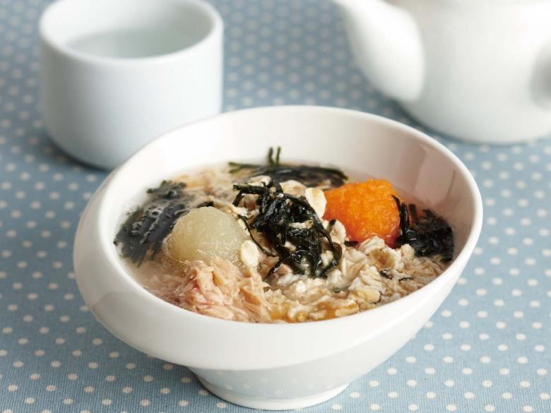 Step 2在蔬菜湯中加入麥片泡軟,加入鮪魚及海苔絲調味。