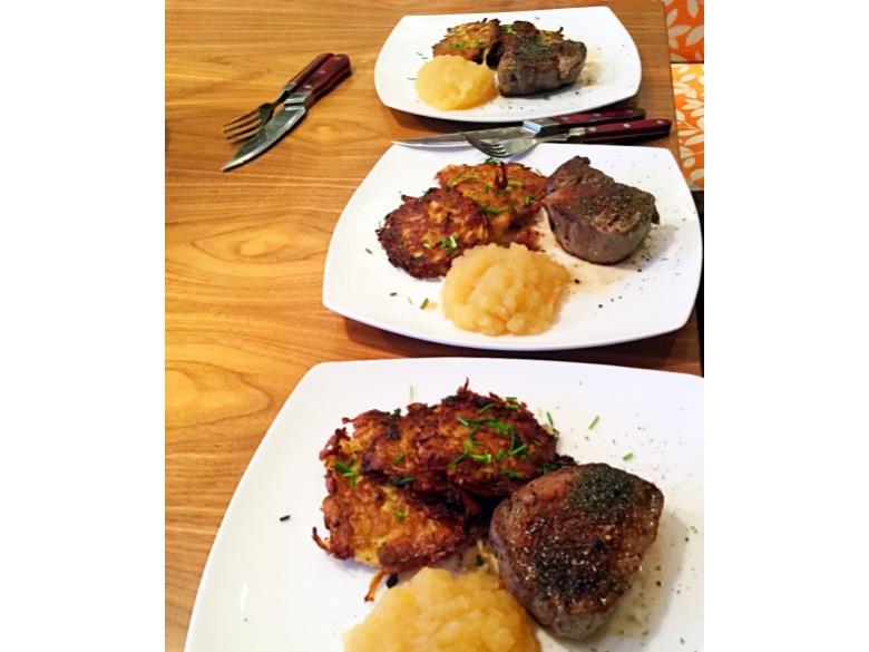 Step 6蘋果泥與薯餅搭配煎牛排享用。