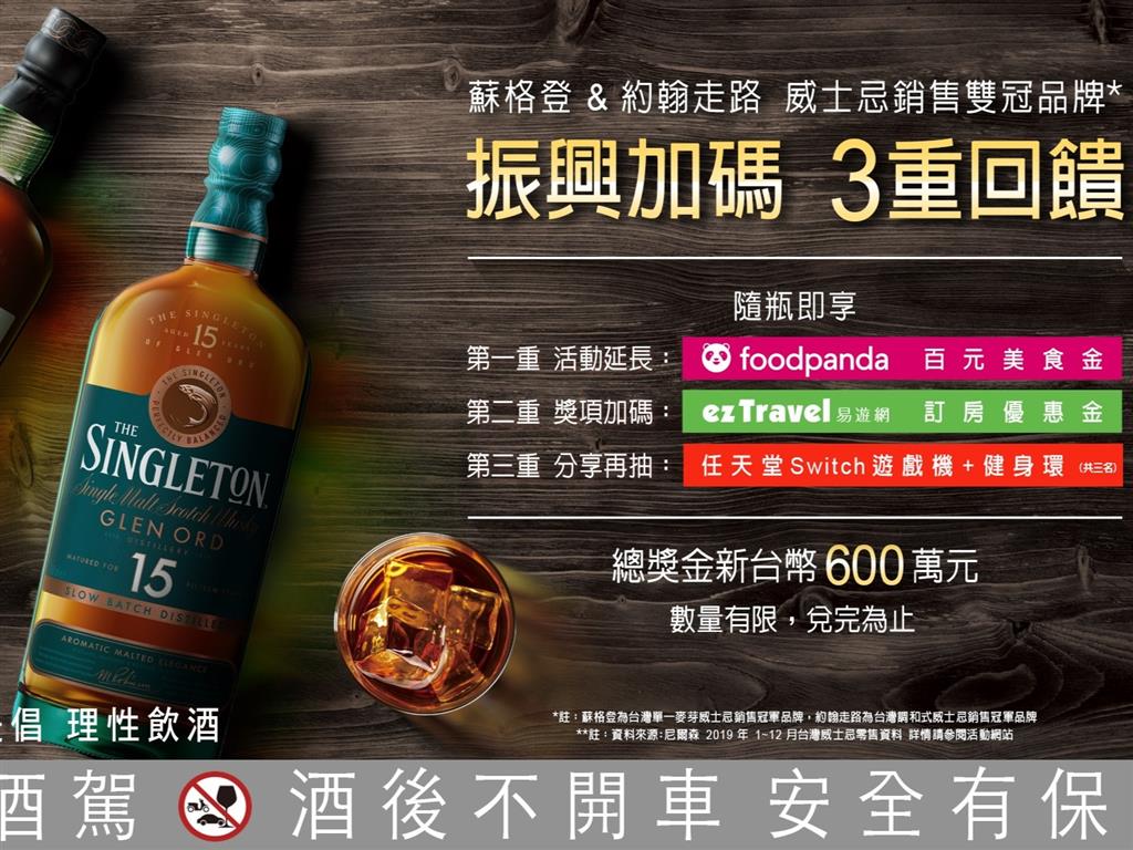 因應共享經濟盛行及全球防疫落實生活,蘇格登與Foodpanda及ezTravel合作,推出「振興加碼三重回饋」活動,即日起至2020年9月30日凡購買「蘇格登12年單一麥芽威士忌 醇雪莉版700ml」、「蘇格登15年單一麥芽威士忌700ml」、「約翰走路黑牌1000ml」、「約翰走路15年封.蜜雪莉桶700ml」,隨瓶憑活動貼紙掃描QR Code至活動網站詳閱相關使用辦法後,即可獲得Foodpanda優惠美食金及ezTravel台灣訂房優惠金。
