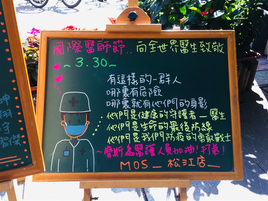 摩斯透過全台店鋪小黑板為發聲管道,小黑板寫著「防疫路上,摩斯與您攜手同行」、「第一線防疫夥伴加油」等等各種打氣話語。摩斯漢堡與醫護站在同一陣線,即日起至2020年3月30日推出醫師節咖啡優惠活動,摩斯咖啡第2杯半價,及2020年3月30日國際醫師節當天更推出摩斯咖啡買1送1優惠,為台灣及全球第一線的醫護人員致敬。