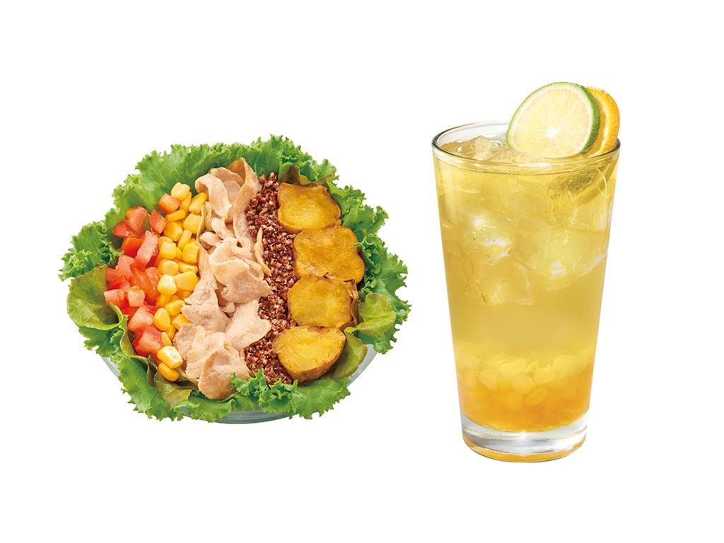 「藜麥豚燒總匯沙拉」使用多款蔬食,有青生菜、萵苣、蕃茄、玉米、冰烤蕃藷及「超級食物」之稱的藜麥等,搭配口感細緻且富含維生素的紅橡木萵苣,再放上薄鹽清炒豚燒肉片,嚴選8種食材製作成營養豐富又飽足的鮮蔬沙拉,清爽風味是夏日輕食首選。
