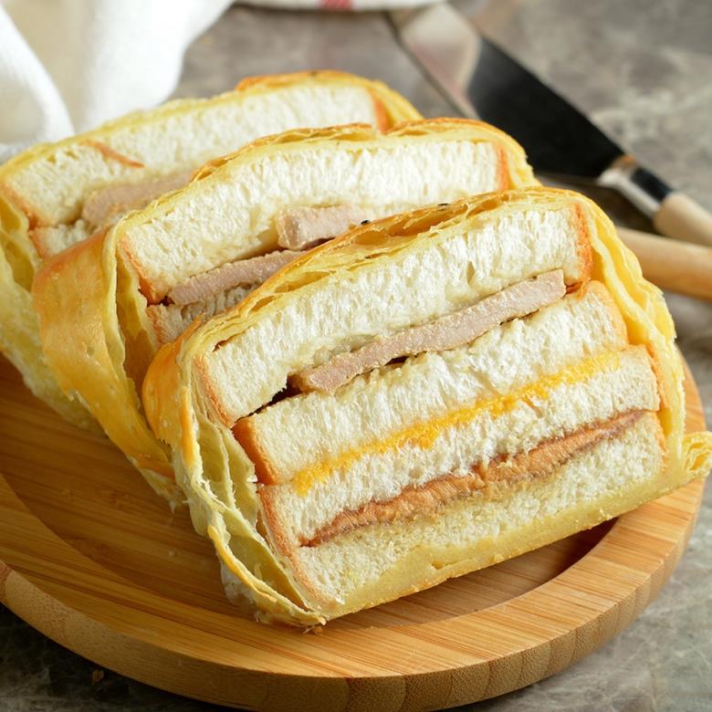 法式花生醬豬排起酥三明治:純手工製作的千層起酥外皮,包覆特製的三明治,烤出香氣濃郁的酥脆起酥皮,搭上使用精選食材的火腿肉、特選肉鬆,以及香濃起司和花生醬,一口咬下感受多層口感的驚豔,是全家大小都喜愛的超人氣排隊商品。