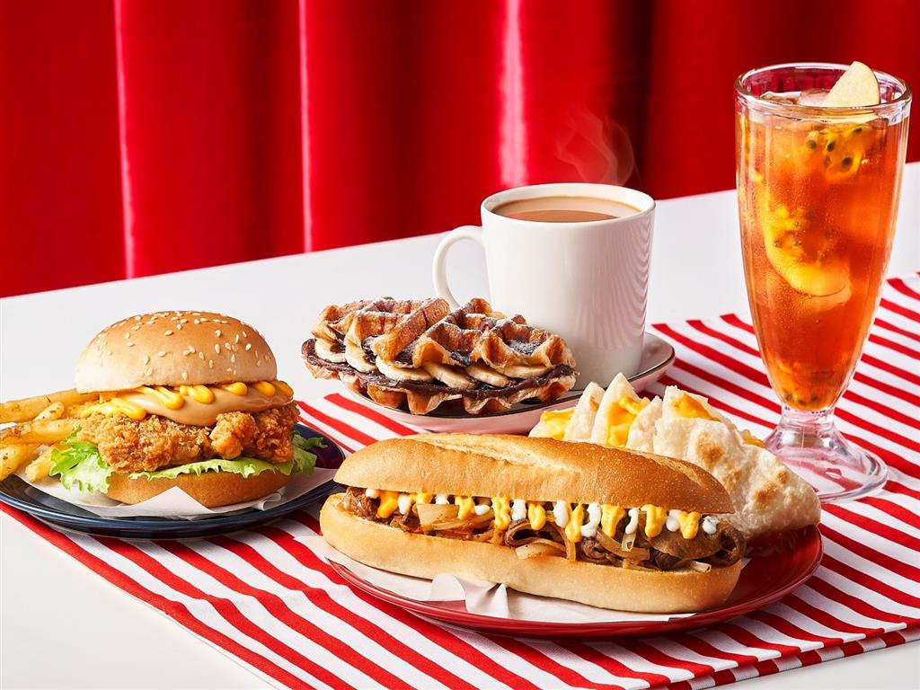 早餐人氣王吐司系列在美東站也不缺席,「濃郁起士玉米歐姆蛋吐司」包裹香甜玉米及香濃乳酪絲的滑嫩歐姆蛋,淋上濃郁的起士醬,再夾入現烤吐司,一口咬下,起士與蛋奶香氣撲鼻而來!人氣經典的「香蕉巧克力可朗芙」則以台灣在地香蕉,抹上濃郁巧克力醬及Hershey's巧克力淋醬,可朗芙酥脆口感讓每一口的幸福滋味都令人著迷。「三重起士烤餅」則是現烤酥脆餅皮中夾入三重不同起士,餅皮與起士完美融合。早午餐必備的飲品則推出兩款全新品項,「極選厚乳茶」用阿薩姆紅茶為基底,馥郁飽滿的茶香伴隨著奶香,香氣更溫潤順口,超人氣「水果茶」則是使用錫蘭紅茶搭配清新綜合水果,果香四溢、滋味甜蜜卻不膩口,完美比例調配,讓人忍不住一口接一口!