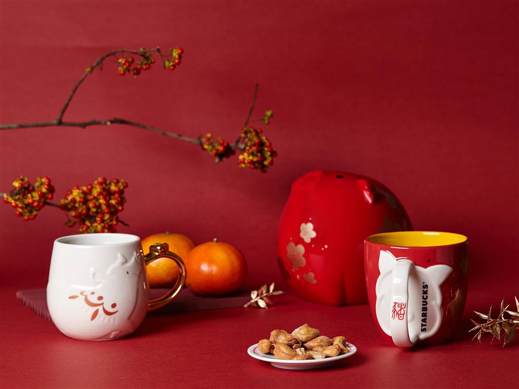 「星巴克」今年除了必收藏的豬年馬克杯、豬年撲滿及豬年熊寶寶外,再推出隨行杯、杯盤等超過30幾項商品,好運招進門,新春諸事大吉。